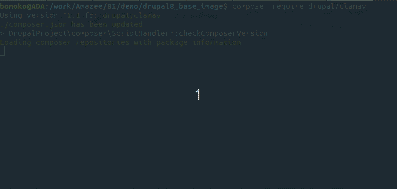 In our example, we are adding the ClamAV module to the Drupal 8 base image. This involves a few steps. The first is requiring the package so that it gets added to our composer.json file. This is done by running a composer require.